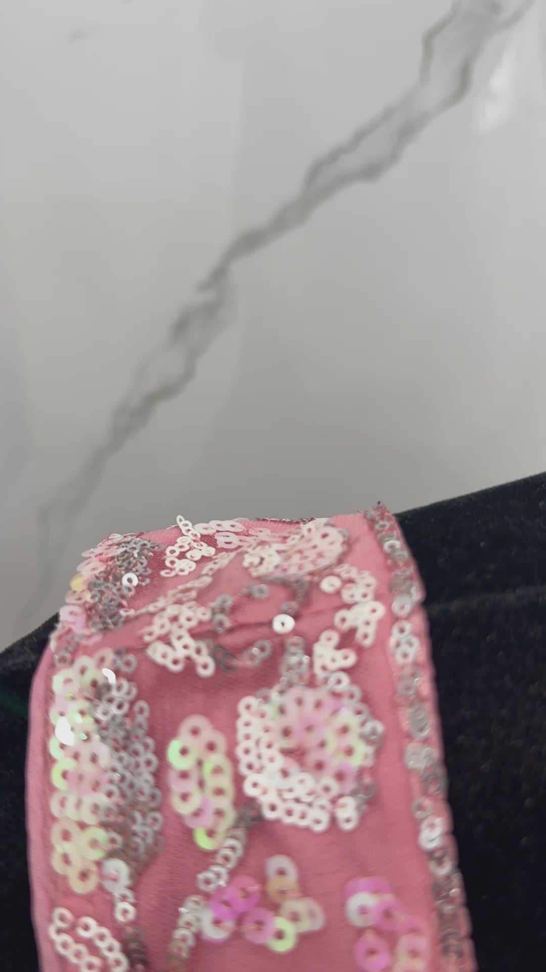 - This stunning ensemble includes a pink color net lehenga adorned with sequin and embroidered work, a matching net choli with similar detailing, and a net dupatta featuring sequin and thread embroidered work with a beautiful lace border.